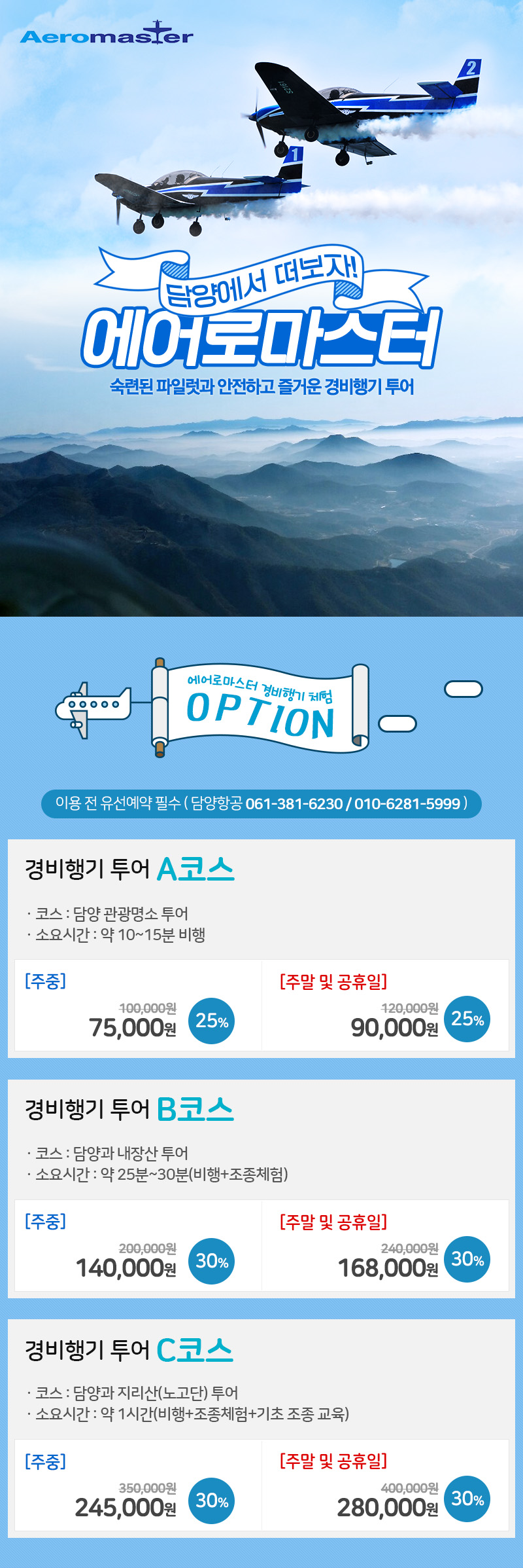 3) 유선예약 에어로마스터(담양항공) 061-381-6230