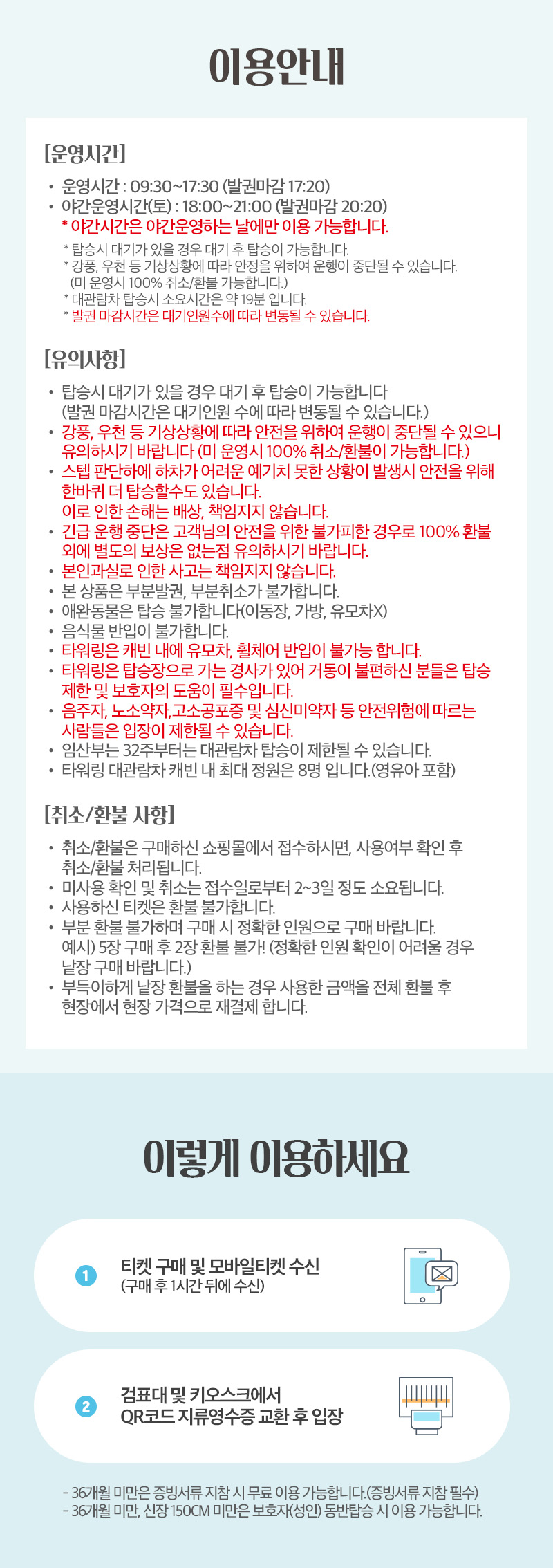 • 타워링은 탑승장으로 가는 경사가 있어 거동이 불편하신 분들은 탑승제한 및 보호자의 도움이 필수입니다.